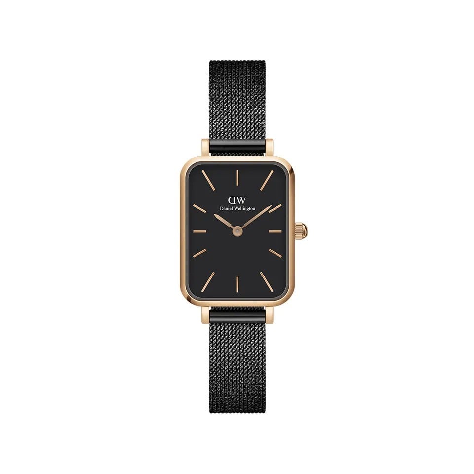 Thiết kế thanh lịch, tối giản và hiện đại. Mặt chữ nhật nhỏ gọn 20×26 mm, dây kim loại dạng lưới full đen cùng với mặt số đen kết hợp cọc số vàng hồng hiển thị rõ ràng dễ phối đồ. Máy Quartz chính xác, chống nước 3 ATM — phù hợp đi làm, dạo phố hay đi học. Nét tinh tế, sang trọng rất hợp với phong cách nữ tính hiện đại.