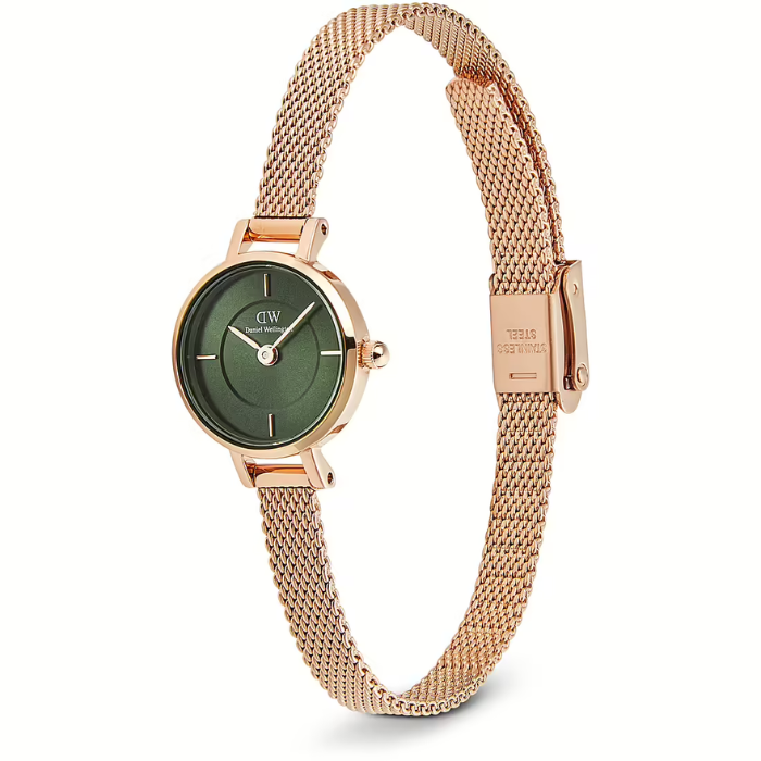Sắc xanh lá đậm của mặt số tạo nên điểm nhấn cá tính, trong khi dây lưới vàng hồng lấp lánh mang lại vẻ ngoài cực kỳ nữ tính. Một chiếc đồng hồ vừa là phụ kiện, vừa là tuyên ngôn thời trang đẳng cấp.