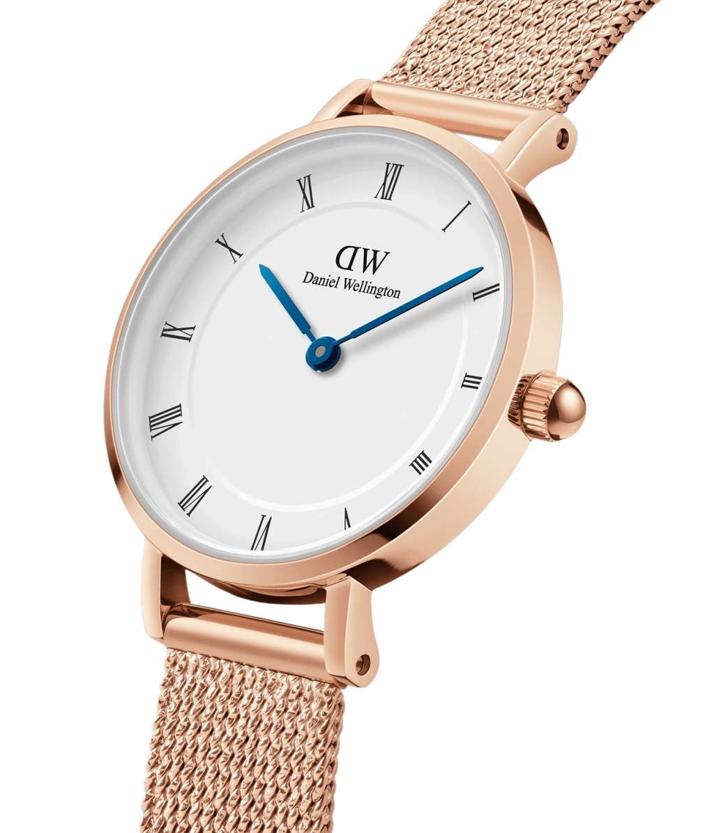 Thiết kế nhỏ gọn 28mm thanh lịch với mặt trắng, kim xanh và số La Mã cổ điển. Dây lưới mesh vàng hồng sang trọng, tôn dáng cổ tay nữ. Máy quartz bền bỉ, chống nước 3ATM – phù hợp phong cách tinh tế, hiện đại.