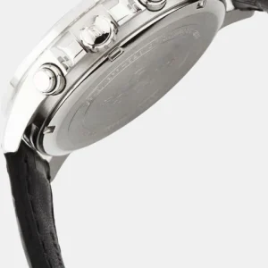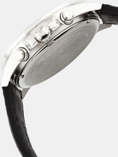 Sang trọng với dây da đen, tích hợp chronograph và lịch ngày, chống nước 100 m, phù hợp dùng hằng ngày và đi làm.