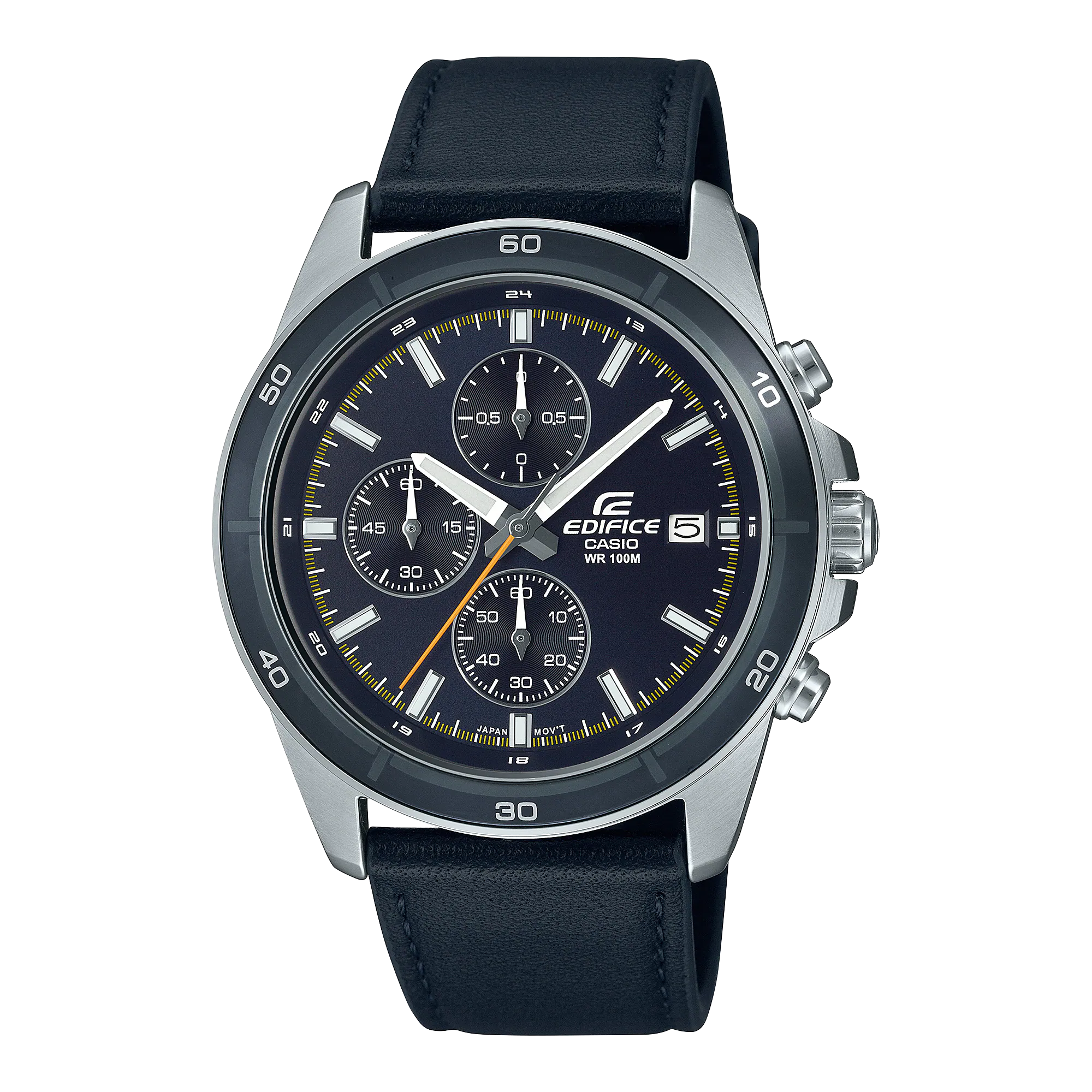 Đồng hồ bấm giờ EDIFICE cổ điển cỡ trung có sự kết hợp táo bạo giữa các chi tiết và thiết kế tinh xảo là sản phẩm sinh ra để dành cho bạn. Dây đeo bằng da thật kết hợp với mặt số màu xám đậm, lấy cảm hứng từ phong cách lái xe thành thị sành điệu.