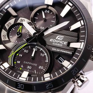 Đồng hồ ghi thời gian EQS-940DB chạy bằng năng lượng mặt trời có mặt số lồng ấn tượng bên trong mặt đồng hồ được thiết kế để tăng chiều sâu và tính đa chiều. Các ký hiệu chỉ số dày, sắc nét tạo thêm điểm nhấn mạnh mẽ và gây chú ý. Kim giây có màu xanh lá huỳnh quang bắt mắt phù hợp với những người hâm mộ xe đua thể thao, đam mê tốc độ.