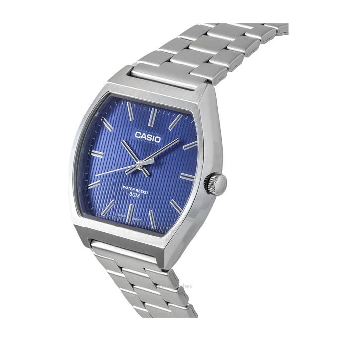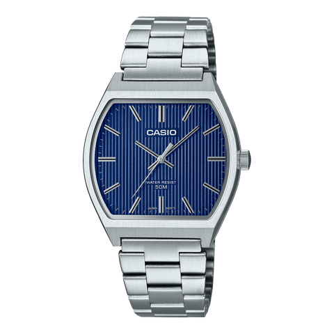Đồng hồ Casio nam phong cách cổ điển với mặt xanh dương và dây thép không gỉ, thiết kế tối giản phù hợp sử dụng hàng ngày và môi trường công sở