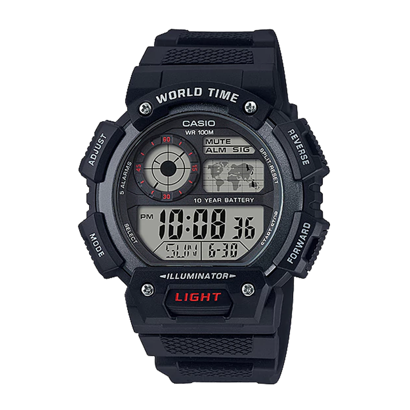 Đồng hồ kỹ thuật số nam phong cách thể thao, mặt số lớn, chống nước 100 m, pin ~ 10 năm; tích hợp giờ thế giới, bấm giờ, đếm ngược, đèn LED và báo thức — phù hợp đeo hàng ngày, đi học, làm việc hoặc du lịch.