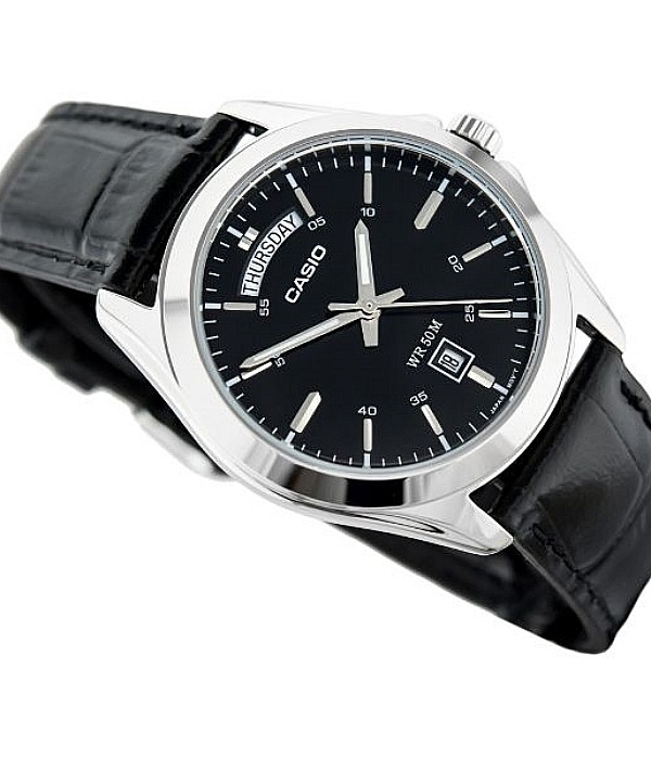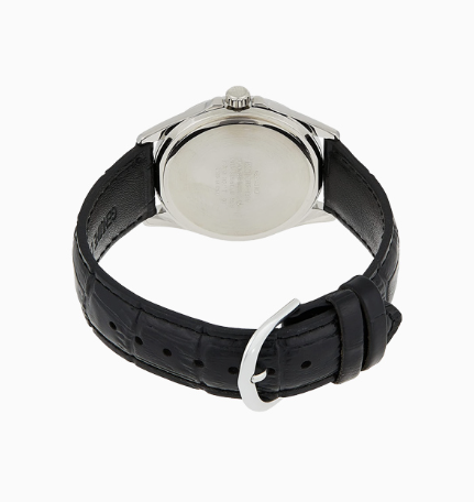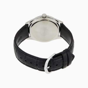 Thanh lịch với 3 mặt số phụ hiển thị ngày, thứ và 24 giờ, dây da đen sang trọng, chống nước 50 m, thích hợp dùng hằng ngày và đi làm.