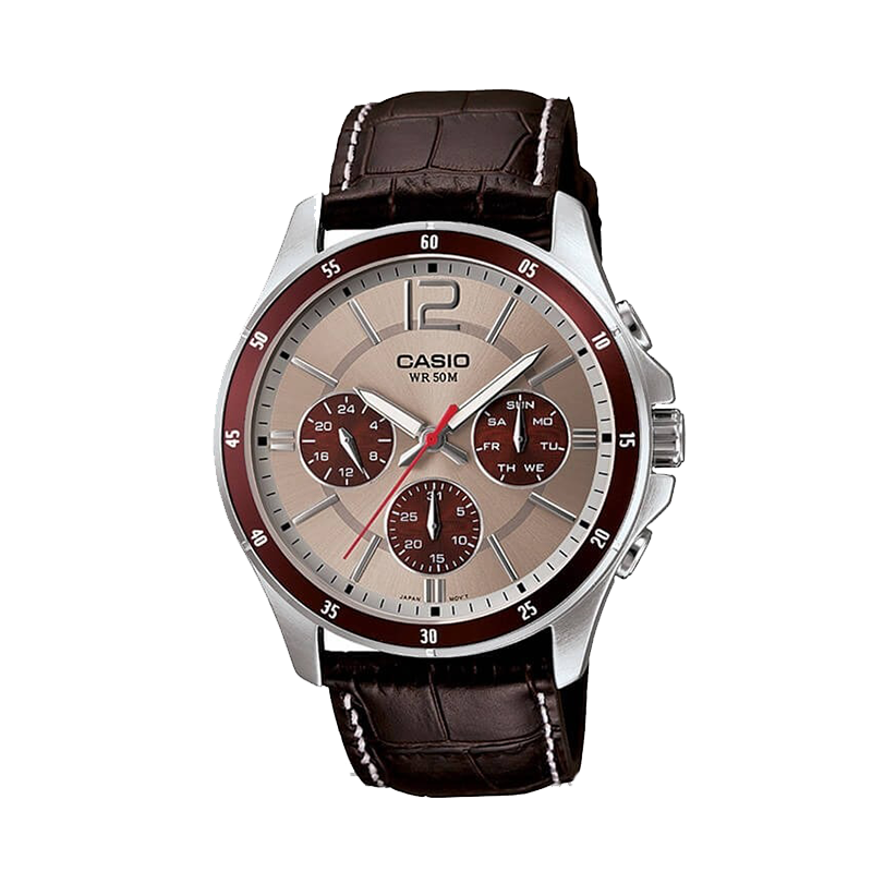 hiết kế thanh lịch với 3 mặt số phụ hiển thị ngày, thứ và 24 giờ, dây da sang trọng và tính năng chịu nước 50 m, phù hợp đeo hằng ngày và đi làm.