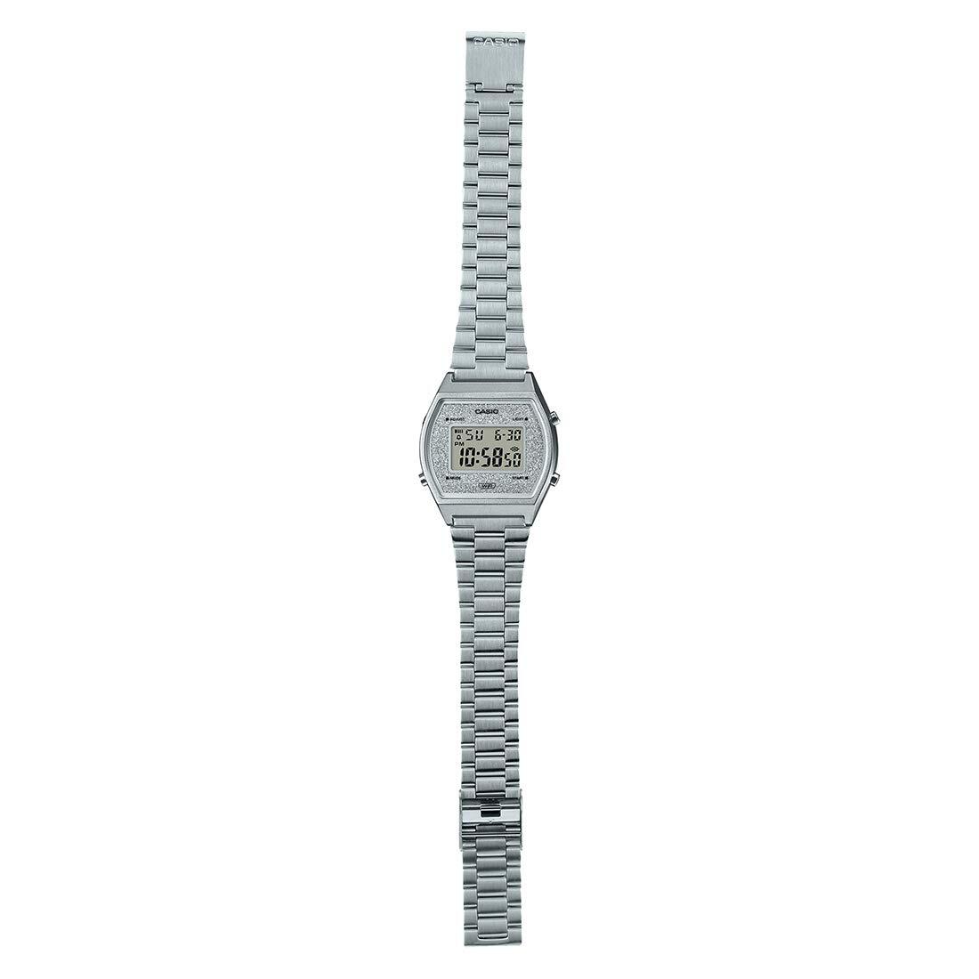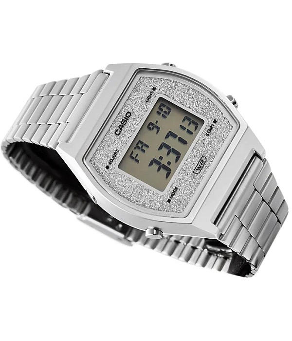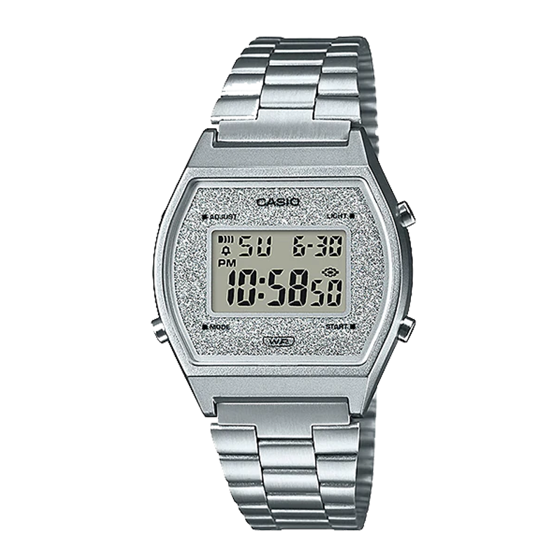 Thiết kế digital vintage mặt trắng thanh lịch, dây thép sang trọng, có báo thức, bấm giờ và đèn LED, phù hợp đeo hằng ngày.