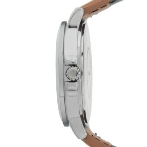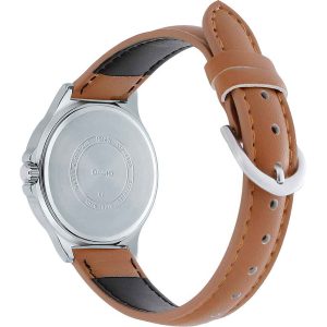 ồng hồ nữ nhỏ gọn, thanh lịch với mặt trắng và dây da nâu, hiển thị giờ, phút, giây + lịch ngày‑thứ‑24h. Thiết kế nhẹ (~30 g), vỏ kim loại + kính khoáng bền, chống nước nhẹ 3 ATM — phù hợp đeo hàng ngày, đi học, đi làm hoặc đi chơi.