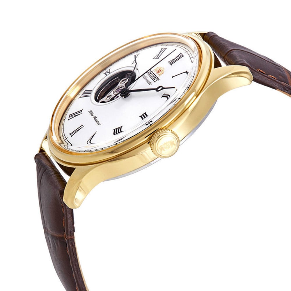 Thiết kế cổ điển sang trọng, mặt trắng – vỏ vàng nổi bật, open-heart lộ cơ tinh xảo.”