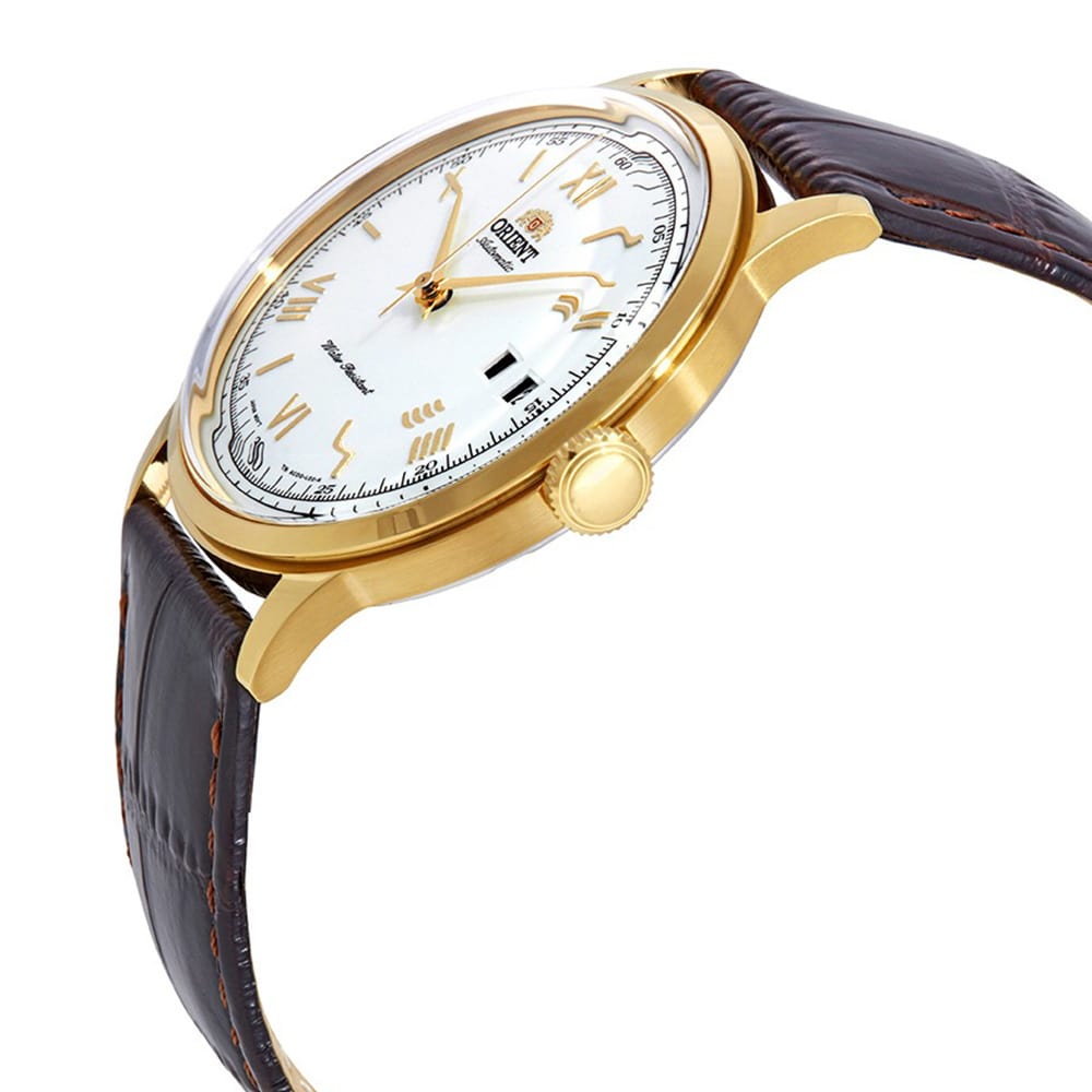 Thiết kế cổ điển sang trọng với mặt trắng, vỏ vàng, dây da nâu và kính cong đặc trưng Bambino. Máy cơ Nhật bền bỉ, trữ cót 40 giờ, lịch ngày tiện dụng.”