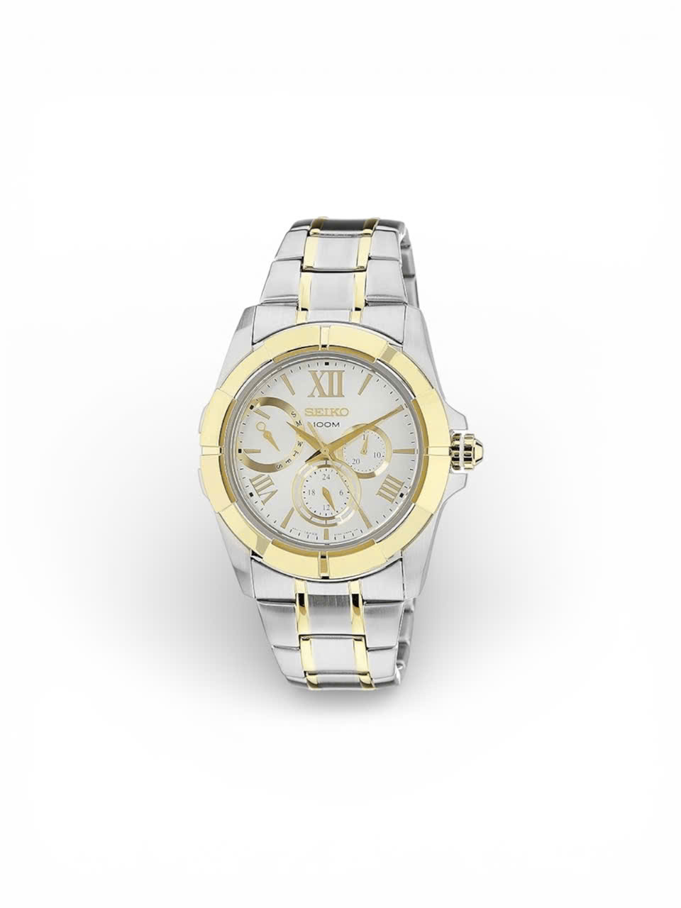 Thiết kế Demi Gold cuốn hút: Vỏ và dây đeo làm từ thép không gỉ 316L, nhấn nhá bằng các dải mạ vàng PVD sang trọng trên nền bạc sáng bóng.