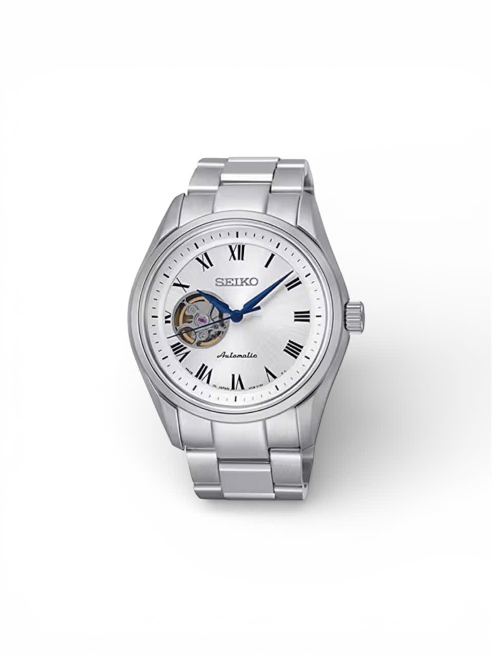 Là một mẫu đồng hồ cơ tự động (automatic) mang phong cách sang trọng và hiện đại. Điểm nhấn nổi bật là thiết kế lộ tim (open heart) độc đáo trên nền mặt số trắng, cho phép quan sát một phần bộ máy cơ khí chính xác bên trong.