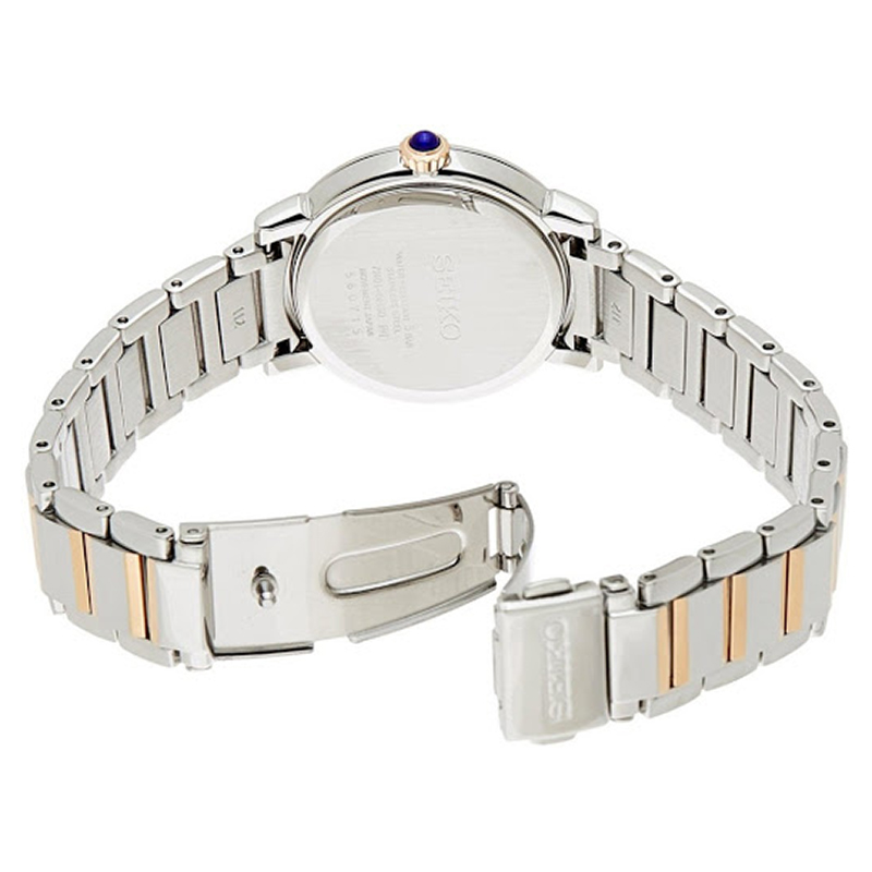 Nổi bật với thiết kế hai tông màu (bạc và vàng hồng PVD) cùng mặt số trắng trang nhã đính số La Mã, dễ dàng phối hợp với nhiều loại trang phục từ công sở đến dạo phố.Với đường kính mặt 30mm, đồng hồ vừa vặn và tôn lên vẻ nữ tính cho cổ tay phái đẹp.